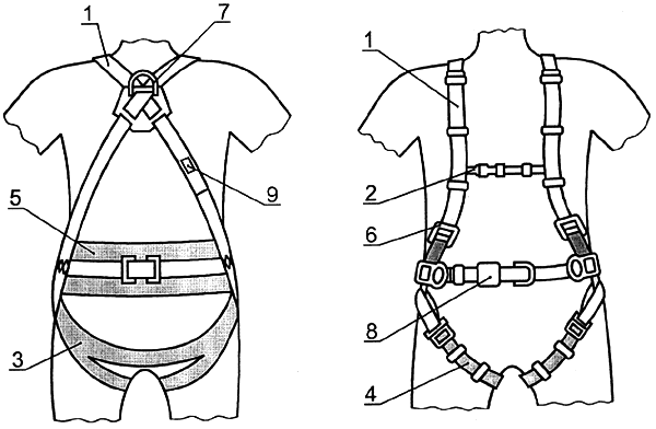 вспомогательная лямка; 3 - задняя лямка (основная);4 - набедренная лямка;